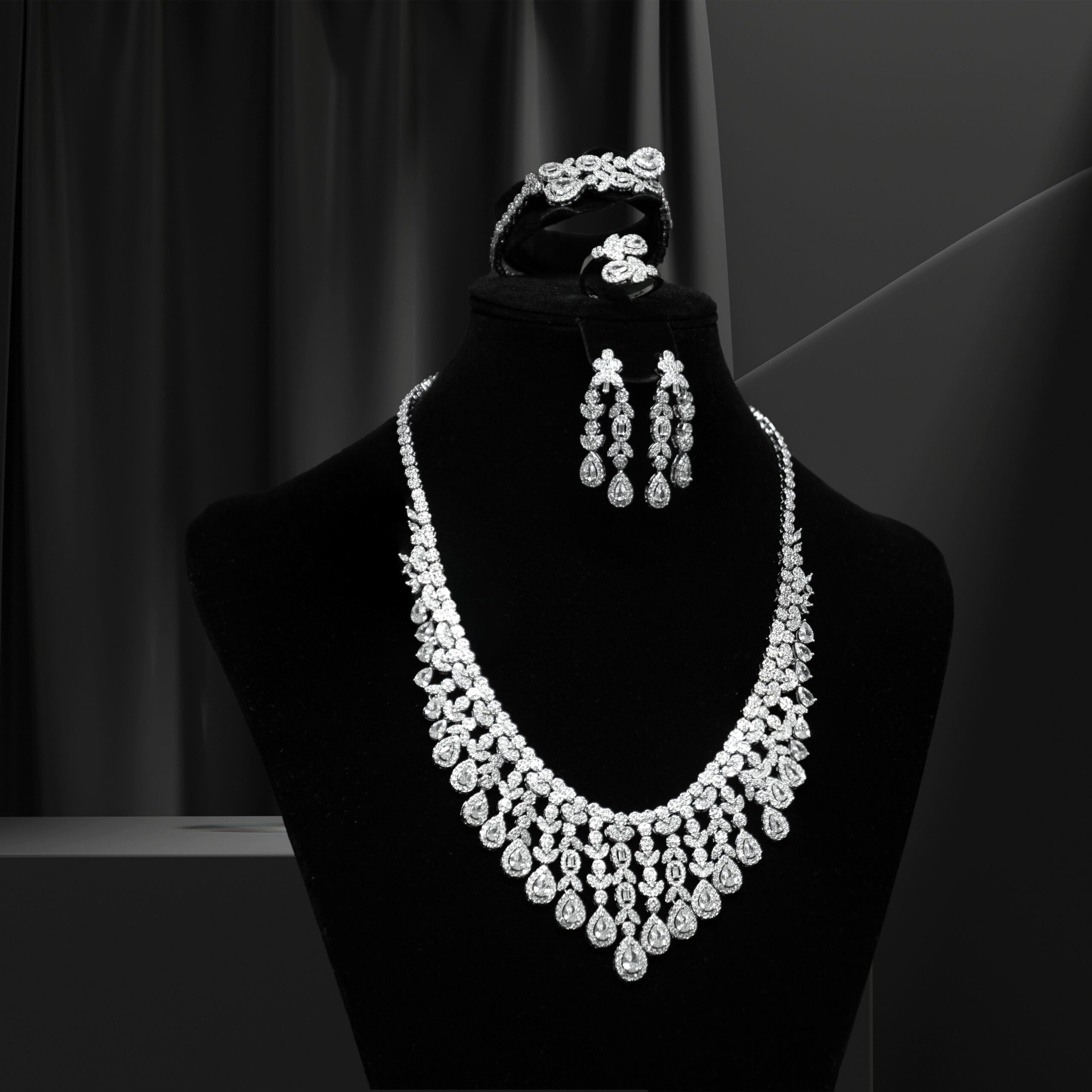 تم تصميم هذه المجموعة المتلألئة بدقة لتناسب فخامتك وأناقتك! تتميز القلادة بزينة الأحجار الكريمة على شكل دمعة وأحجار مستديرة الشكل، وتتدلى كالشلال بعَظَمَة وجمال نحو أسفل رقبة ملكتنا. هذه القلادة تصوِّر جوهر التألق، وتعكس الضوء نفسه على القطع البرَّاقة الأخرى، وتخلق تناغماً ساحراً بينها!