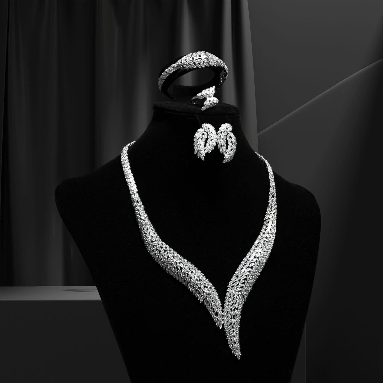 الجمال الخارج عن المألوف! . تنتظرك هذه المجموعة الأنثوية المتوهجة لمرافقتك في ذكرياتك التي لا تُنسى. سلسلة سماوية من الحجارة المتلألئة تزين رقبتك، وتضفي جمالاً سحرياً للقطع الأخرى. يتدلى عصفورا الحب برشاقة من أذنيك، يرمزان إليك وإلى رفيق روحك وأنتما تهمسان بالوعود الجميلة لبعضكما البعض..