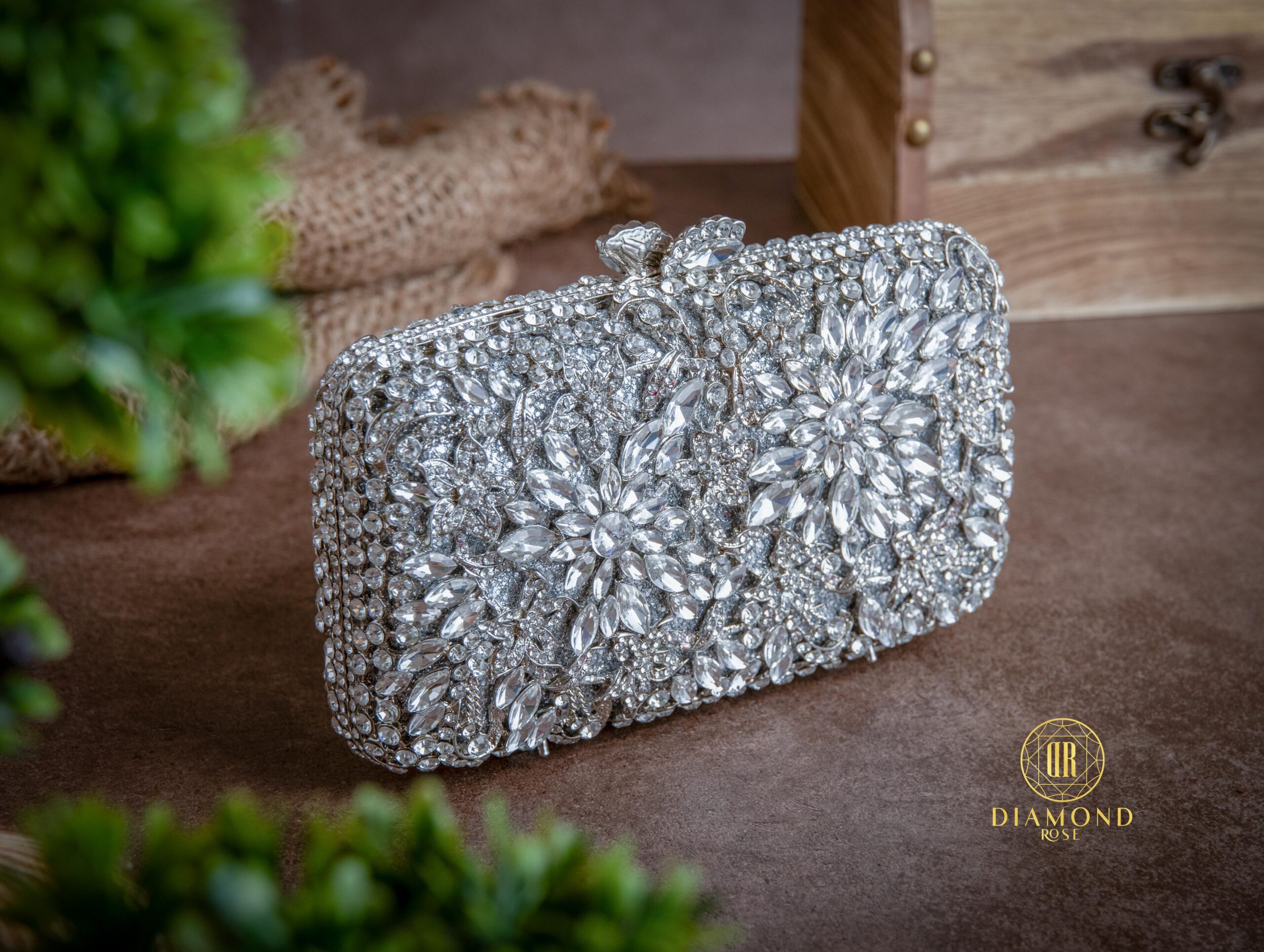This glamorous clutch is illuminated by the moon’s sparkling glow. Its intricate design of delicate roses and shimmering beads catches the light and reflects the beams upon your elegant beauty, revealing the finest taste and sophistication. This enchanting clutch is the impeccable choice for your regal soirées!